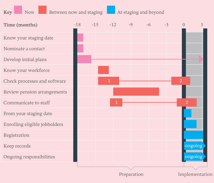 On average it takes between 12-18 months to set up your workplace pension (as recommended by the pensions regulator). This time planner will help you visualize your plans.